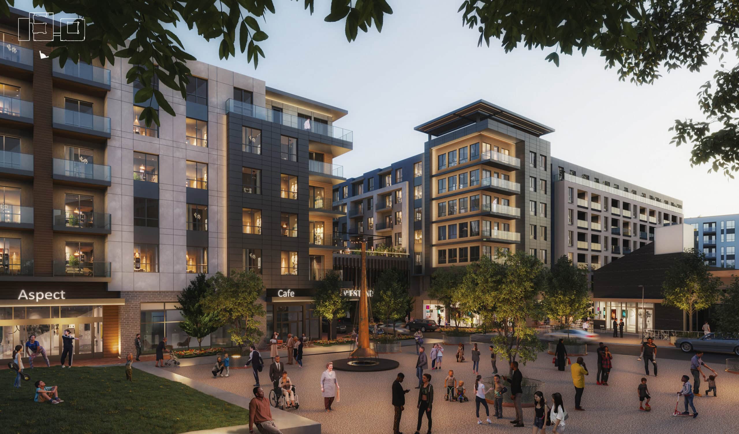 Within this emerging district, Aspect will deliver 390 modern apartment residences and approximately 66,000 square feet of ground-floor retail designed to activate the surrounding streets and public spaces. The seven-story development will consist of two buildings connected by a majestic sky bridge containing the project’s fitness center and shared resident amenities.